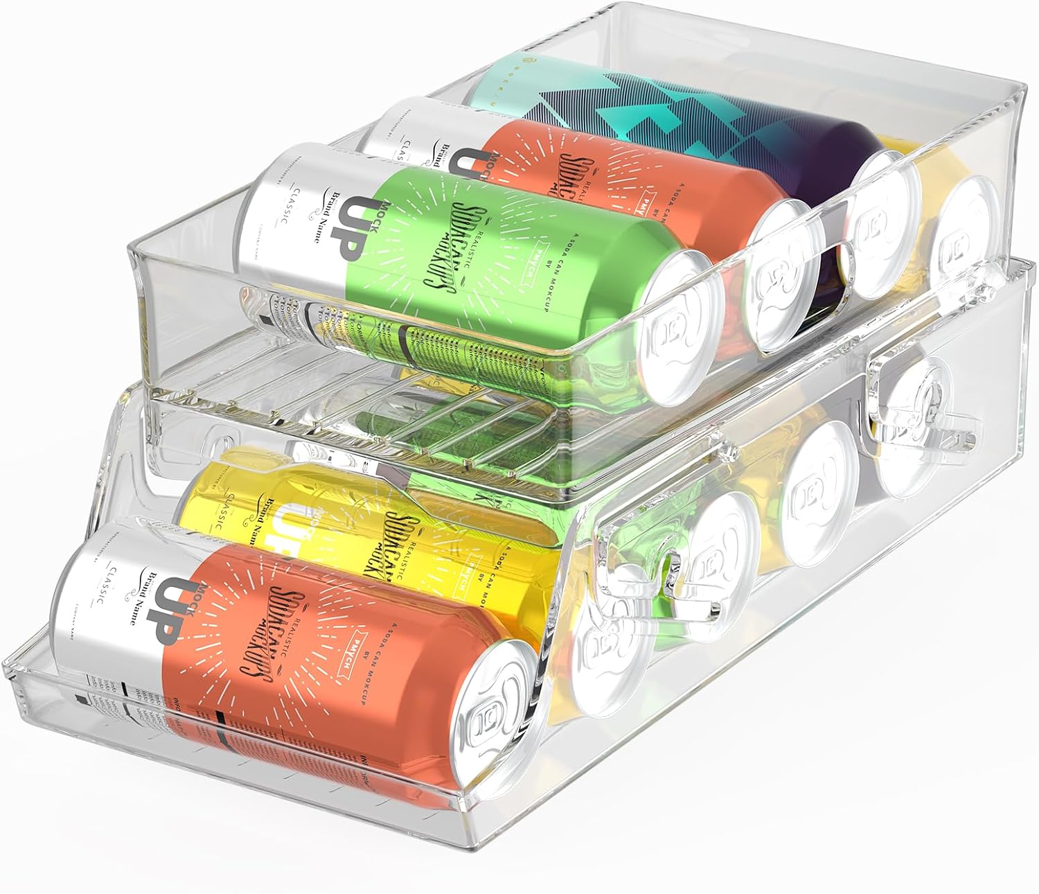 - Fridge organiser cans 2 levels: can dispenser can hold 9-11 standard sizes of 250 ml or 330 ml drink cans. Whether cola, fanta, lemonades or beer, everything is allowed, the cans now have their firm place in the cooling furniture. Sizes: 33.5 x 17 x 14 cm, the depth of your refrigerator should be more than 34 cm.
