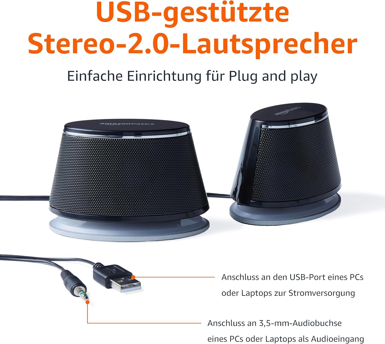 Pereche de boxe stereo 2.0 negre Amazon Basics pentru PC Laptop Intrare AUX de 3,5 mm Alimentare USB