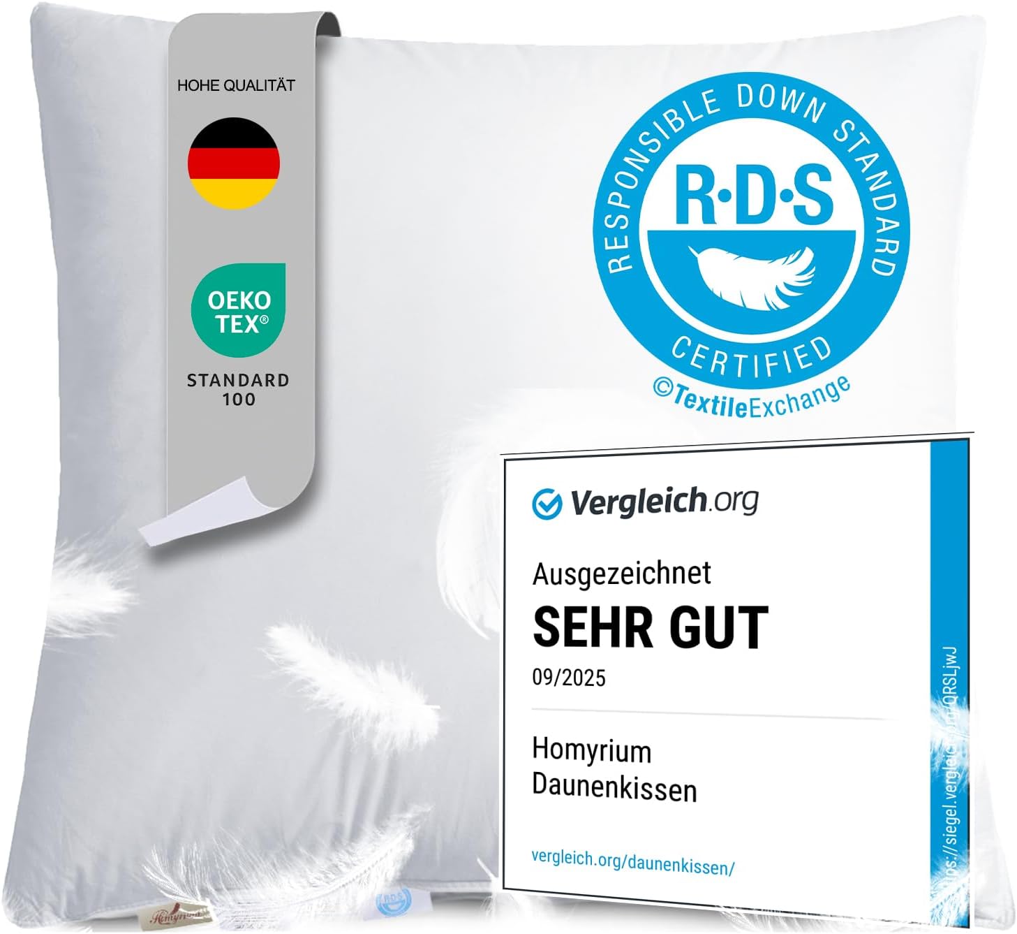 - Three chamber design: excellent three-layer design. The two outer chambers have a filling weight of 200 g (90% down – 10% feathers) and each outer chamber contains 100 g filling. The inner chamber has a filling weight of 1400 grams (100% feathers). While the feathers in the inner chamber provide optimal support for the neck and head, the down in the outer chamber provide softness and avoid the discomfort caused by sticking out feathers.