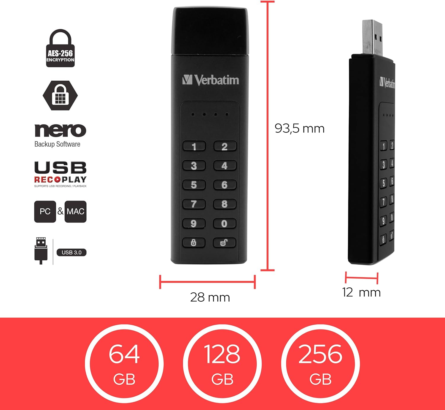 - Encrypted – The keypad secure stick from Verbatim is equipped with particularly secure AES hardware encryption and passcode protection. So your data is safe anytime and anywhere.